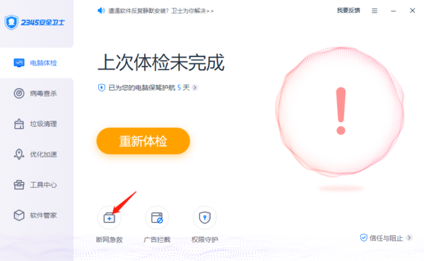 2345安全卫士的断网急救也是非常简单,只需我们打开2345安全卫士,在体检界面的左下方,我们就可以看到【断网急救】按钮。