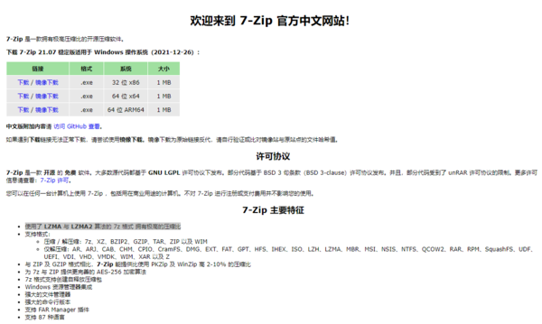 7-Zip是一款开源的免费软件,大多数源代码都基于GNULGPL许可协议下发布,部分代码基于BSD3句条款许可协议发布。而且7-zip使用了LZMA与LZMA2算法的7z格式,其拥有极高的压缩比;除此之外,7-zip还拥有中文官网,这让我们在下载它的时候可以省去很多麻烦。