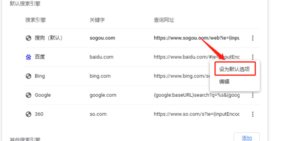 接着在设置界面的左侧选项栏目中找到“搜索引擎”,在右侧点击“管理搜索引擎”,找到自己需要设置的默认主页,点击后面的三个点,然后选择“设置默认选项”。