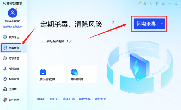 首先打开腾讯电脑管家,在左侧的选项栏中选择“病毒查杀”,然后这时右侧会出现一个“闪电杀毒”按钮点击就会开始查杀电脑中的病毒。