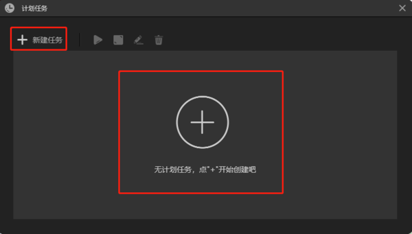 同样是在傲软录屏的主面板中,点击下方的“计划任务”字样,在弹出的计划任务窗口,点击页面中间的加号键来新建任务。