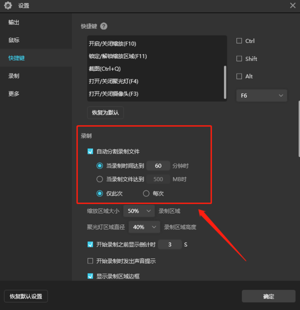 如果担心录制的视频文件因为时长而过大的话,我们也可以提前设置好自动分割功能。点击傲软录屏主页面中的设置键,跳转到设置窗口后,下滑找到“自动分割录制文件”选项。勾选该选项后,用户还需要设置录制视频的分割条件,可以按时长或者是文件大小来分割。