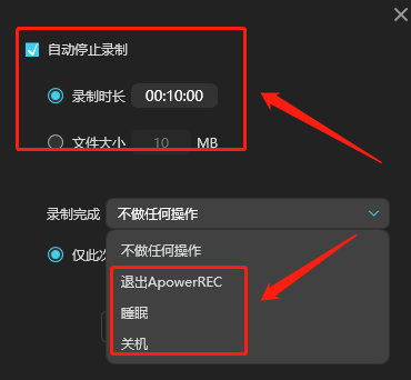 在电脑上打开傲软录屏客户端后,点击主页面下方的“自动停止”字样,在弹出的设置窗口中,设置录制的时长。如果录制完之后,还需要软件自动关闭的话,还可以在“录制完成”选项中,选择“退出ApowerREC”或者是“关机”。