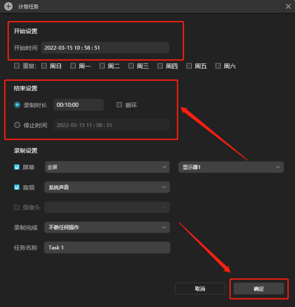 跳转到计划任务设置页面后,选择开始时间为当前,结束时间的话,可以设置录制时长,也可以设置具体的停止时间。建议不清楚视频时长的朋友,直接设置一个具体的停止时间,可以比课程时间稍长点。都设置完成后,点击“确定”键,回到主面板开始录制就行了。