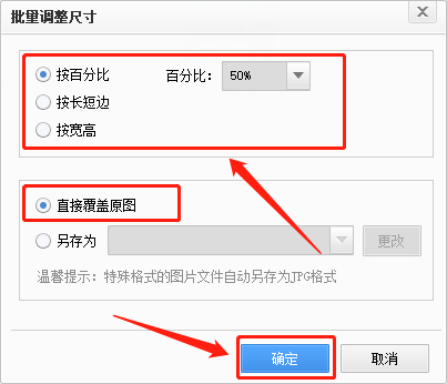 在弹出的尺寸调节窗口中,选择调节方法和保存方式,比如说按百分比调节以及覆盖原图保存,再点击“确定”键,等待软件修改完成就可以了。