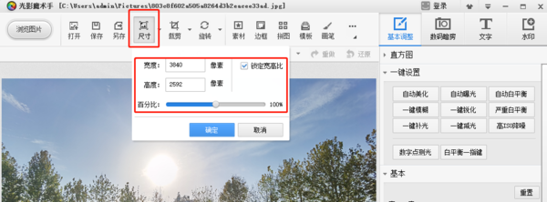 第三步:回到图片预览窗口后,点击图片上方的“尺寸”选项,重新编辑图片的宽高,或者是百分比,再点击“确定”键就能调整修改图片的大小。