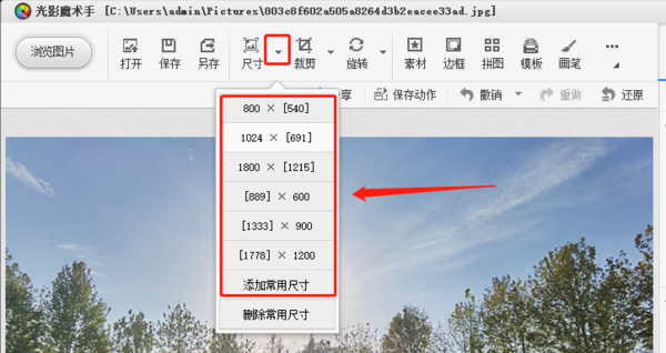 当然了,如果有确切尺寸要求的,也可以直接点击尺寸选项中的向下箭头,设置常用尺寸来修改图片。