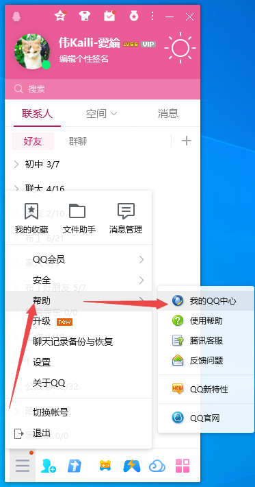2、接着在弹出的选项中,选择【帮助】,然后再点击选择【我的QQ中心】选项。