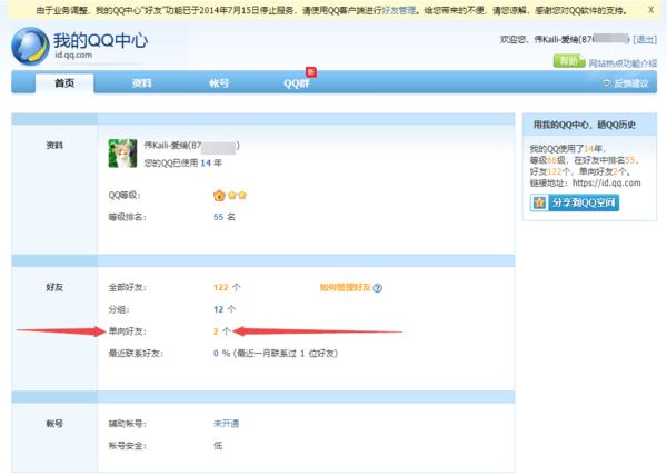 3、然后在弹出的网页界面中,我们找到【好友】选项中的【单项好友】,后面会显示自己账号单项好友的个数,记住这个数量。