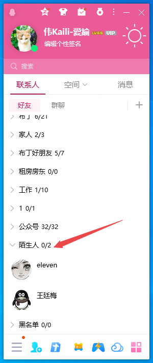 4、最后回到QQ软件的主界面中,找到【陌生人】选项,然后看看这里的陌生人的数量与刚刚的单项好友的数量是否一致,若是一致的话,那么就没有人把你删除了,否则的话就是以后好友把你删除了。