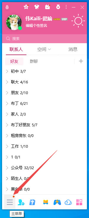 1、打开电脑上的PC版腾讯QQ软件,然后输入自己的账号密码进行登录。然后在QQ的主面板中,找到左下角的【三】主菜单图标,并点击它。