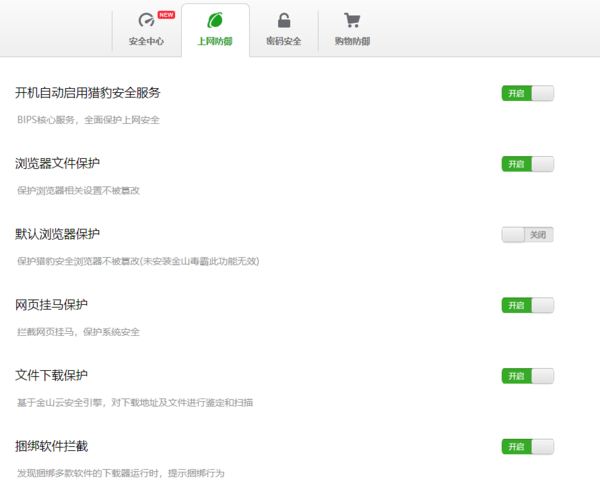这里是猎豹浏览器上网安全防护功能开关设置的地方,我们可以看到,在这里可以开关浏览器文件防护、默认浏览器防护、文件下载保护等防御设置,在全开的情况下,安全还是能得以保障的。