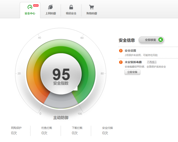 在这里我们可以看到自己目前在猎豹浏览器上网的安全情况,不但可以看到自己的安全分数,系统也会给我们相应的建议。