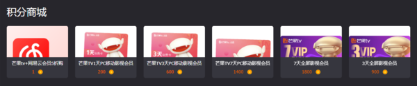 我们可以通过1积分来兑换芒果TV+网易云音乐捆绑包的5折购买券;还可以通过200/600/1400积分来换取1/3/7天的芒果TV“PC移动会员”;或者以900/1800积分换取3/7天的芒果TV“全屏影视会员”。由此可见,积分兑换的奖励还是性价比很高的。