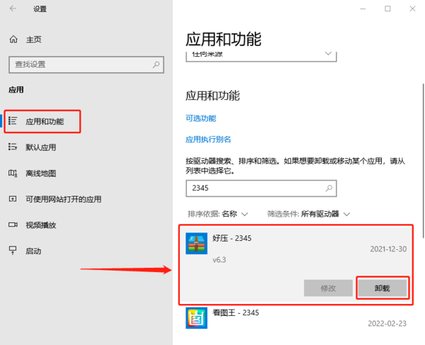 跳转到“应用和功能”设置页面后,下滑或在搜索框中输入2345查找,点击对应的2345好压选项,选择“卸载”键进行卸载就行了。