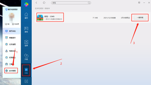 小编这里用腾讯电脑管家为例,打开软件之后,点击“软件管理”选项。在弹出的软件管理窗口,选择“卸载”功能。页面跳转后,同样是下滑或搜索找到2345好压,再点击对应选项右侧的“一键卸载”按钮就完成了。