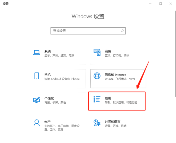 点击电脑左下角的系统图标,选择设置功能,在弹出的Windows设置窗口,点击“应用”选项。