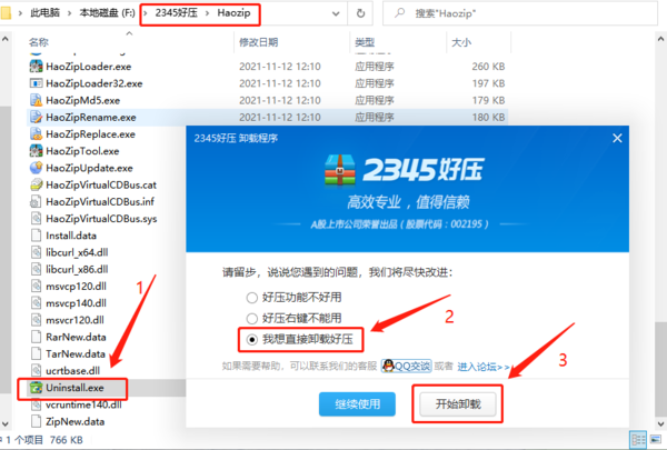 在弹出的2345好压安装文件夹中,下滑找到“Uninstall.exe”应用程序,并双击运行。就会弹出2345好压卸载窗口,选择“我想直接卸载好压”选项,再点击“开始卸载”键就可以了。