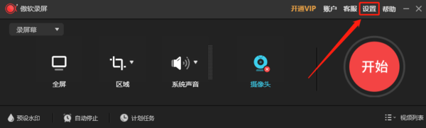 首先,在电脑上打开傲软录屏客户端后,点击页面右上角的“设置”键。
