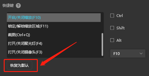 2.如果出现快捷键冲突的话,可以点击下方的“恢复默认”按钮,将快捷键恢复为系统默认的组合设置。