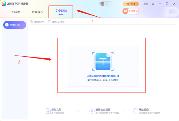 同样是在2345看图王PDF转换器页面,点击上方的“文字识别”选项,页面跳转后,将图片拖拽到方框中。