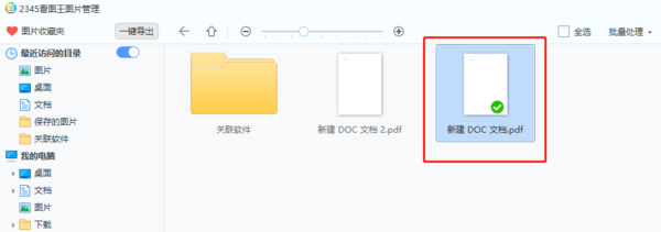 在电脑上找到需要转换的PDF文件后,选中该文件并单击鼠标右键,选择2345看图王右键菜单中的“PDF转图片”,就能直接打开2345看图王PDF转换器。