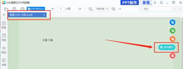 跳转到PDF文件查看窗口后,选中右侧的功能选项图标,点击“转为图片”选项。就能打开2345看图王PDF转换器,进行PDF转图片了。