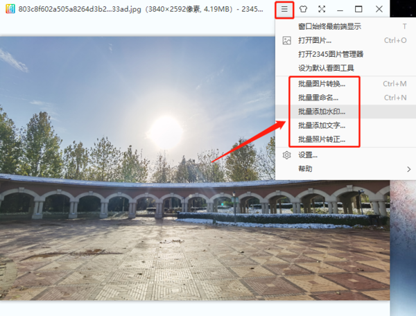 同样是先使用2345看图王打开任意一张图片,点击页面上方的三根横线图标,在弹出的选项栏中,选择对应的批量处理操作,比如说批量添加文字。