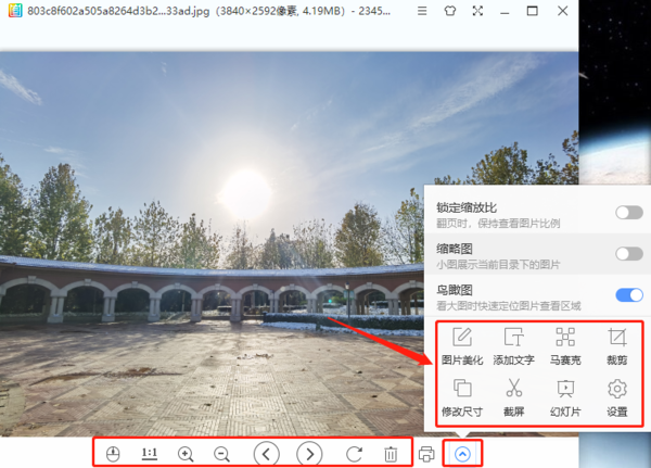 在电脑上使用2345看图王打开图片之后,将鼠标移动到图片上,就会弹出选项条,进行图片的放大和旋转操作。同时,点击右侧的“更多”图标,就能选择使用图片美化、裁剪以及添加文字等功能。