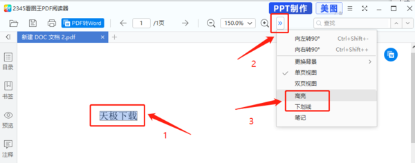 在2345看图王PDF阅读器中,选中需要增添高亮和下划线的文字内容,点击“显示更多功能”图标。在弹出的选项中,选择“高亮”或“下划线”字样就可以了。
