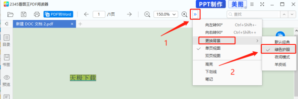 跳转到2345看图王PDF阅读器窗口后,点击上方的“显示更多功能”图标,在“更换背景”选项中,选择其他想要使用的背景,比如说绿色护眼就能完成背景色更换了。