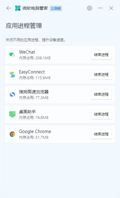 根据小编的亲自使用以及通过查找各种资料来看,微软电脑管家与腾讯电脑管家的功能并不一样,除了一般电脑防护软件都有的电脑查杀、开机启动项管理、垃圾清理等功能外,微软电脑管家还具备应用进程管理的功能,我们在不启动电脑系统的任务管理器的情况下,就可以关闭不用的应用进程,以此来让电脑的运行速度更快。