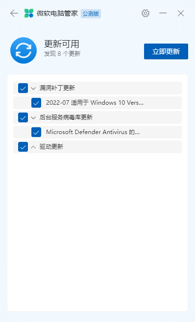同时,微软电脑管家还可以帮助我们检查Windows系统电脑的漏洞补丁、后台服务病毒库、驱动等内容的更新。