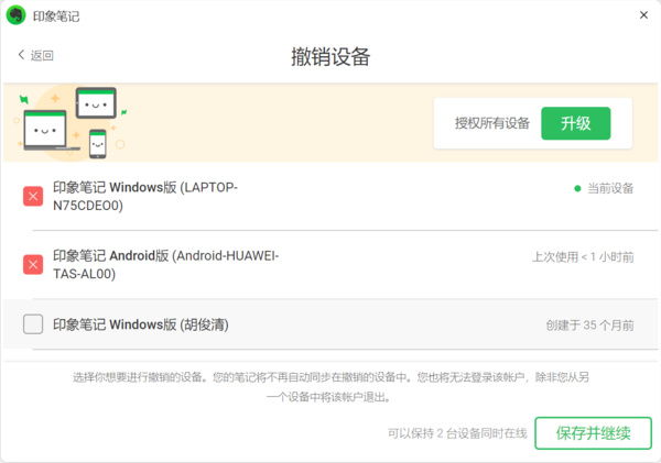 3、我们勾选左侧的方框,打叉代表了要删除此设备的登录信息,保证此页面有最多两个没有打钩的设备即可让免费账户的印象笔记恢复正常使用。