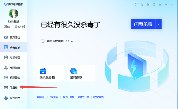 1、启动电脑上的腾讯电脑管家,然后点击软件主界面左侧的【工具箱】。