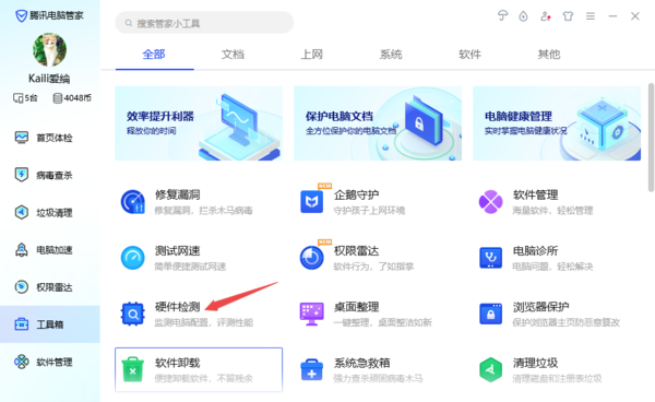 2、接着在右侧的界面中,找到【硬件检测】功能,并点击它,功能首次使用需要安装,可以耐心的等待一下。