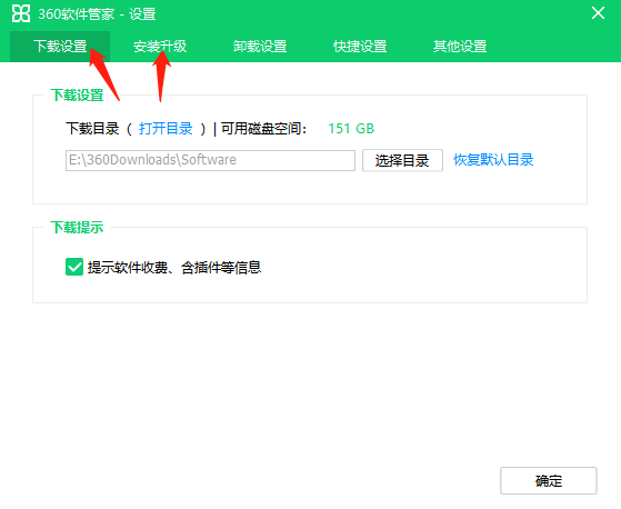 来到设置界面后,我们可以在上方看到模块栏,其中【下载设置】和【安装升级】分别可以让我们调整360软件管家的下载路径和安装路径,操作上还是非常简单的。