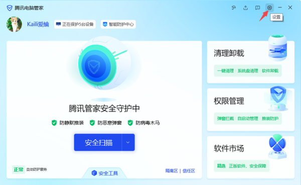 2、如果电脑网络正常,腾讯电脑管家V16的软件市场还是加载不出来的话,接着启动电脑上的腾讯电脑管家V16,然后点击界面顶部右上角的小齿轮【设置】图标。