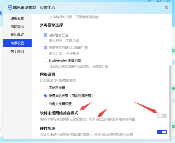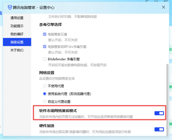 4、然后在右侧的界面进行下滑,然后找到【软件市场网络兼容模式】选项,在该选项下我们可以看到这样的内容,就是当软件市场内的页面无法加载时,可开启此选项修复网络兼容问题。此时我们将【软件市场网络兼容模式】右侧的功能开关滑动打开,一般就可以解决腾讯电脑管家V16软件市场加载不出来的问题了