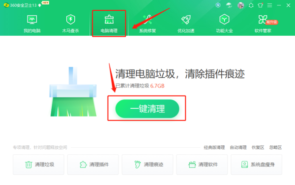 1、首先打开360安全卫士,在上方的导航栏中点击“电脑清理”。接着点击下方的“一键清理”按钮,点击之后软件中会自动开始进行扫描。