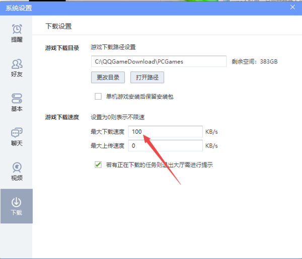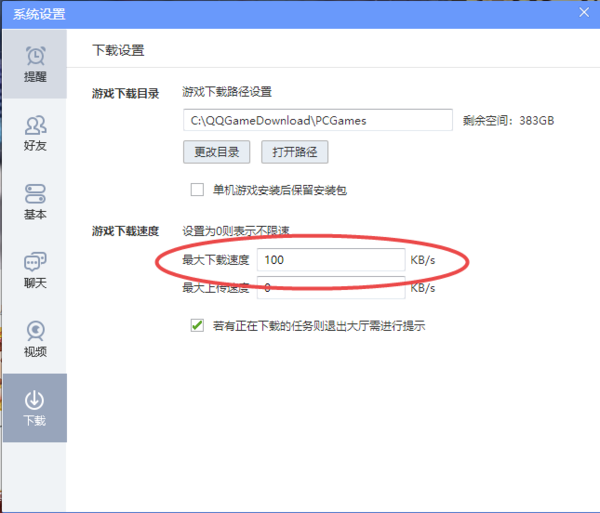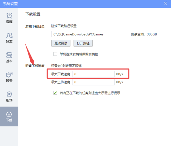 ③然后,我们就进入到软件的下载设置窗口当中了,此时我们找到【游戏下载速度】一栏下的【最大下载速度】选项,这里就是我们设置限制QQ游戏大厅游戏的下载网速的地方了,输入你想要设置的限制网速即可。