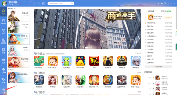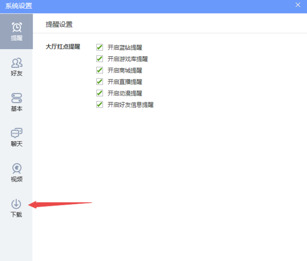 ①在QQ游戏大厅软件的主界面,点击界面左侧列表中的【下载】功能。