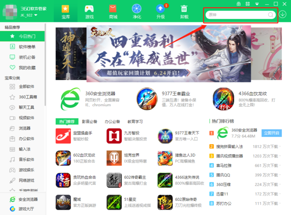 以360软件管家为例,打开软件后,在右上角的输入框中输入需要下载的应用名称,然后按下回车键。