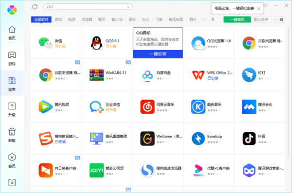 和360软件管家功能相似,腾讯电脑管家中的软件管理中也有丰富的软件资源,在这里我们可以下载安装来用,也可以对这些软件进行管理,例如升级、卸载。