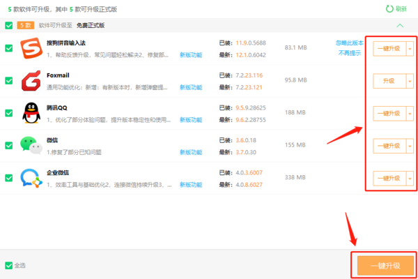 这里可以按照需要给单独某个软件升级,也可以全选后点击下方的“一键升级”。