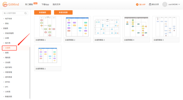 GitMind这款软件中的模板是有很多的,各种类型的图示在这里基本都可以找到。我们需要的泳道图也是能在这里找到的。