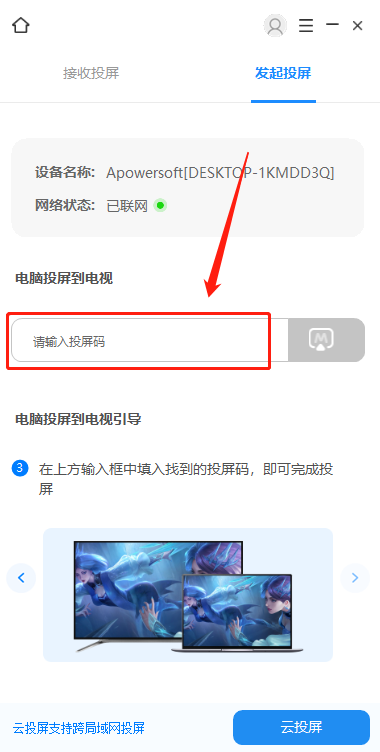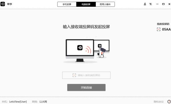 我们将接收端的投屏码输入到下方的输入框中,最后点击输入框下面的“开始连接”,等待匹配连接成功,就可以用电脑向电视端进行投屏了。