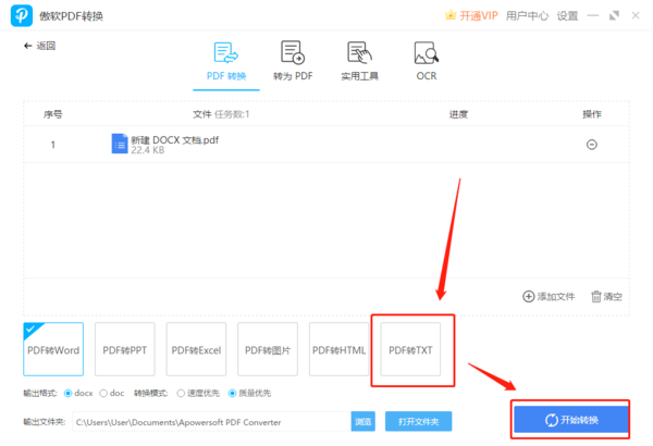 接着我们会进入到转换的界面,在下方选择“PDF转TXT”,在界面的最低端还可以修改文件导出后的存储位置,全部都选择好之后点击右下方的“开始转换”。