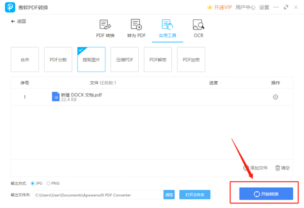 然后在提取界面中,我们可以修改下面的存储位置以及图片的输出格式,最后点击右下角的“开始转换”就可以了。