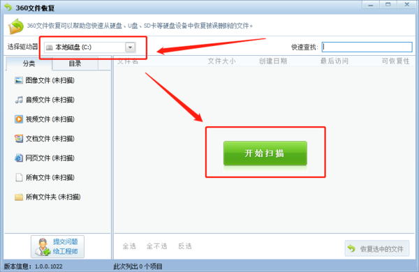 进入到文件恢复界面后,在右上方选择需要进行扫描的位置,接着点击中间的“开始扫描”就可以了。扫描完成后,按照步骤恢复即可。